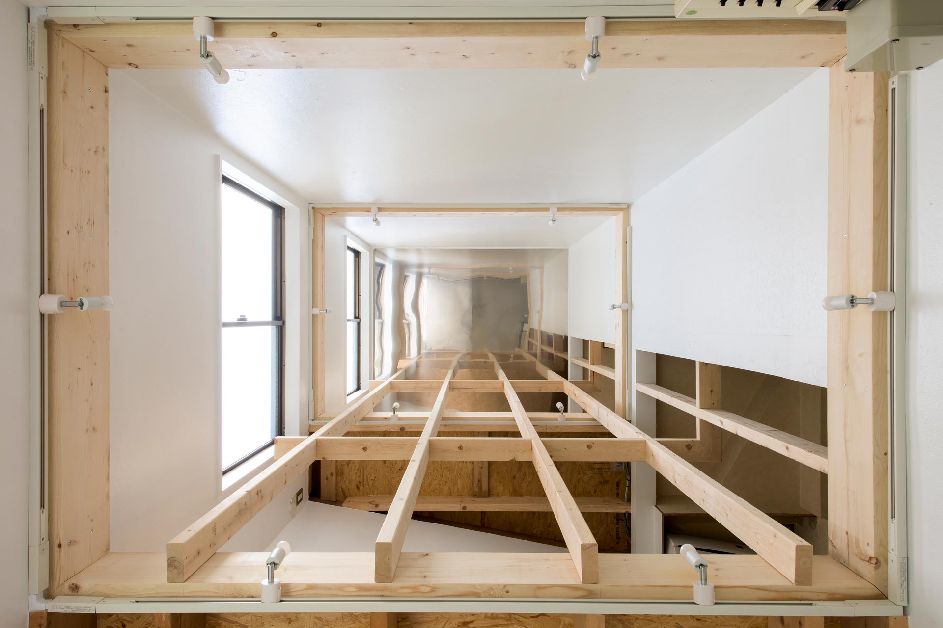 幅一間、3階建のちょんの間長屋という特徴的なプロポーションを生かした、極端に細高いスタジオである。