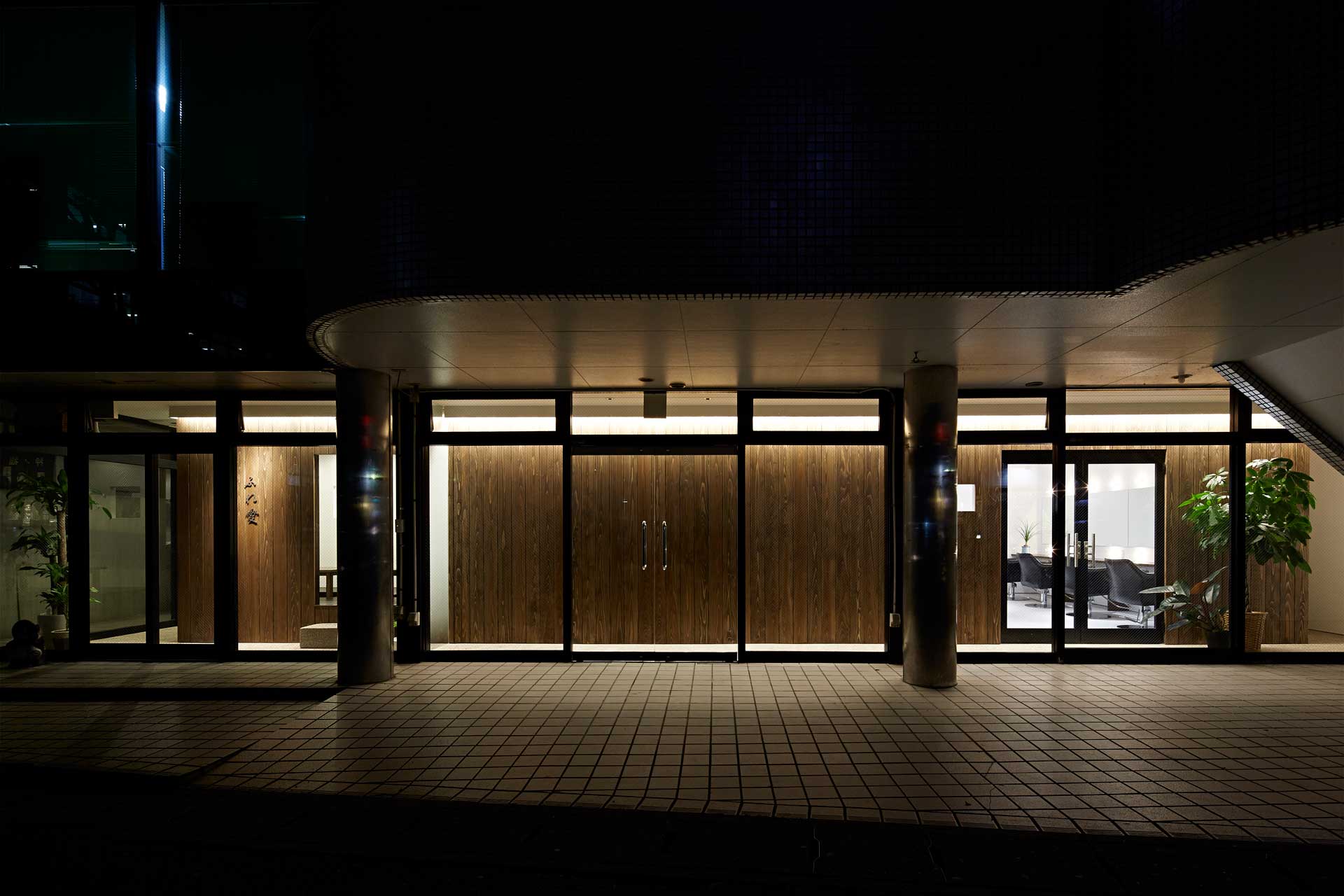 郊外に建つテナントビルの店舗。1フロアに2つあるテナントの入替えが同時期になる、特別な状況を空間に活かすため、既存外周のフロントサッシは新築時の頃の様に装飾を取り払い、その内側に同幅同仕様の回遊動線を巡らせる。